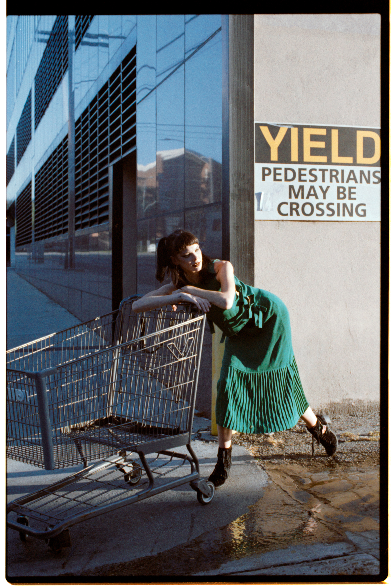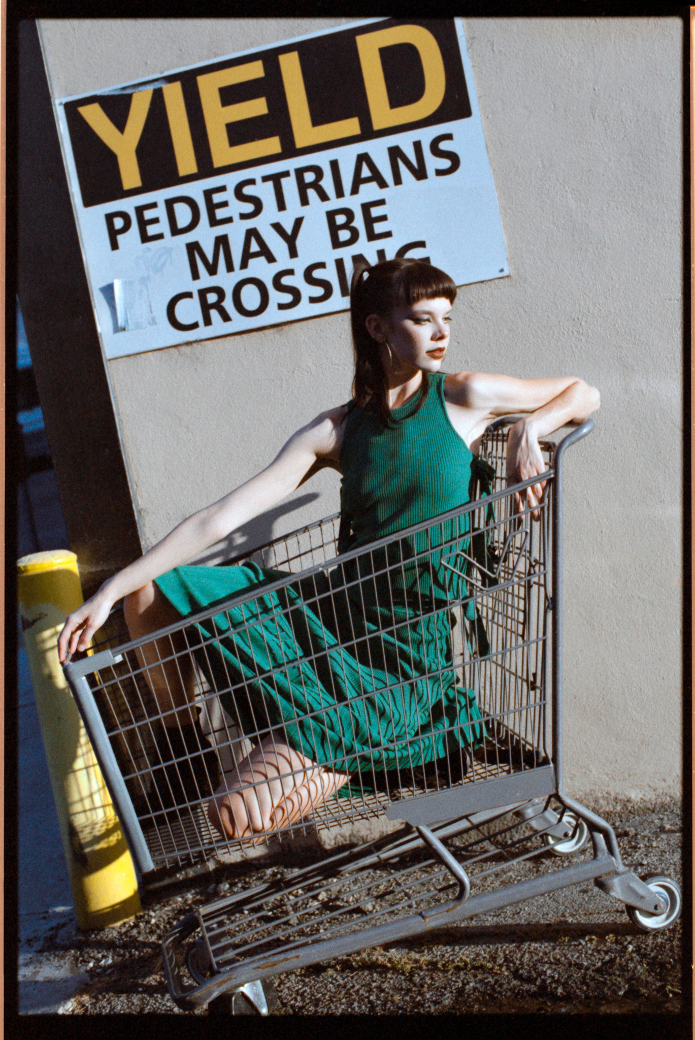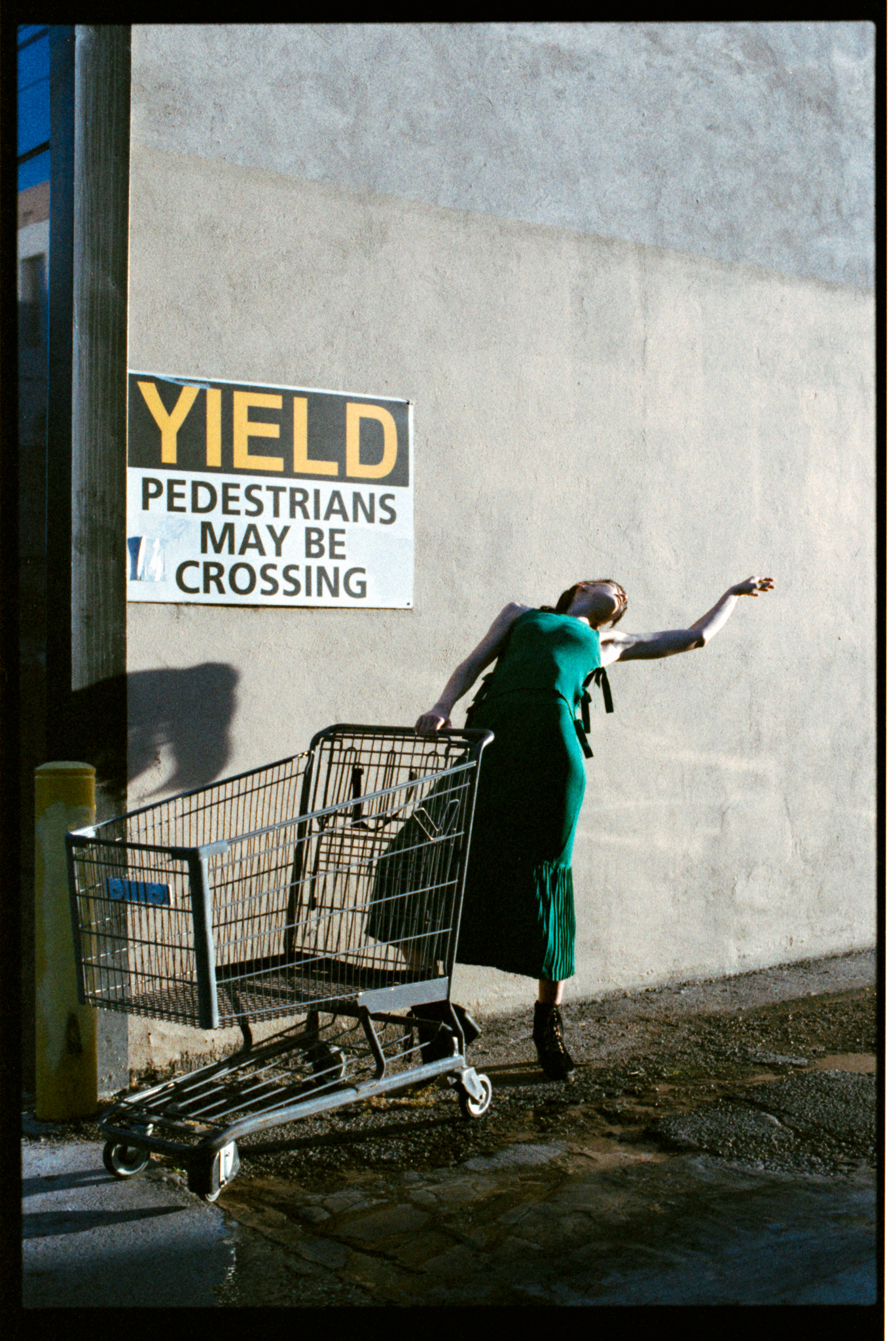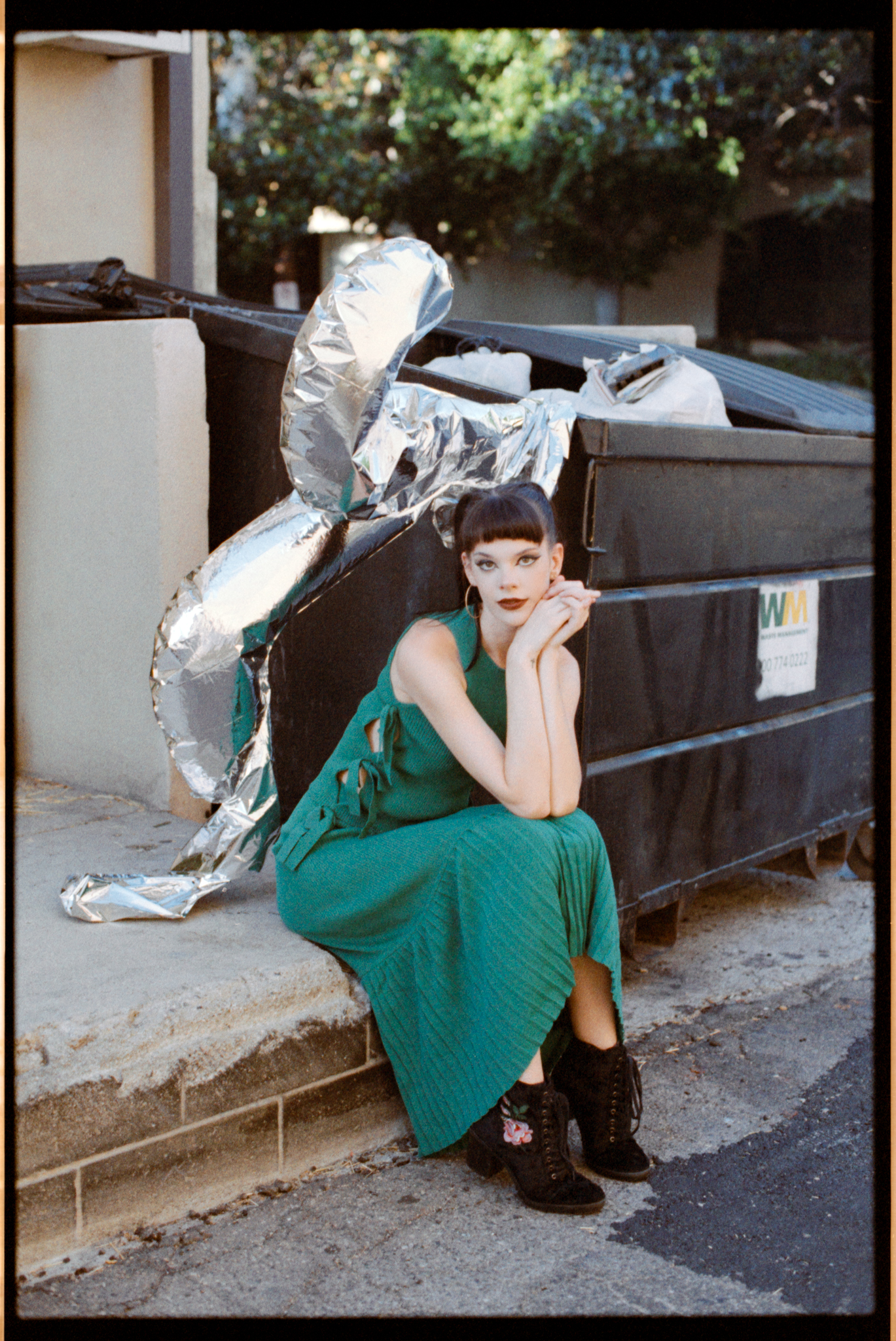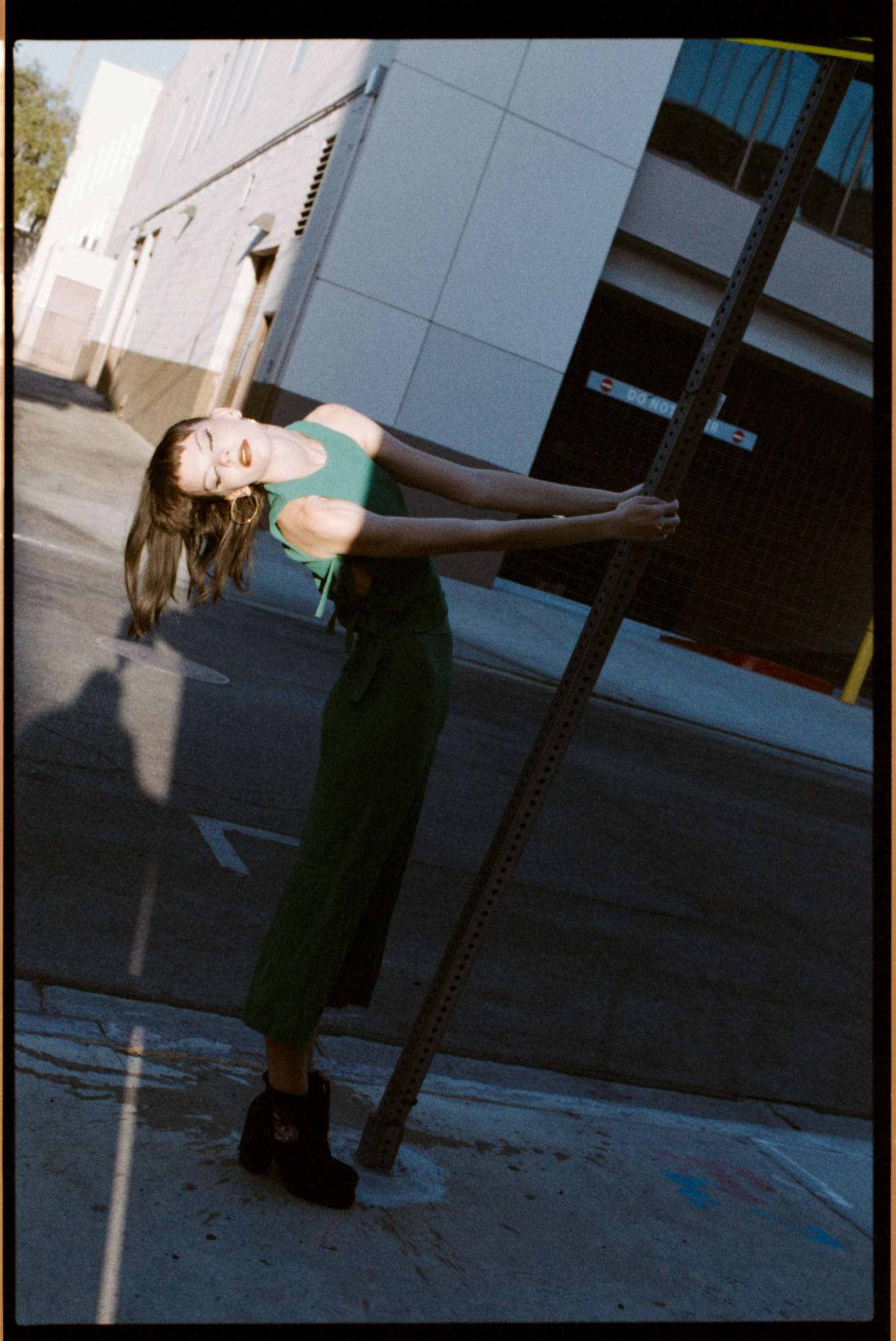 I was shooting at 400 speed. When I try a new film, I always want to try it at box speed first. I saw this dumpster in the alleyway; now we are facing the light, plus the bounce from the wall, the light is soft and even. I think the color and the skin tone look nicer compared to in the shade.