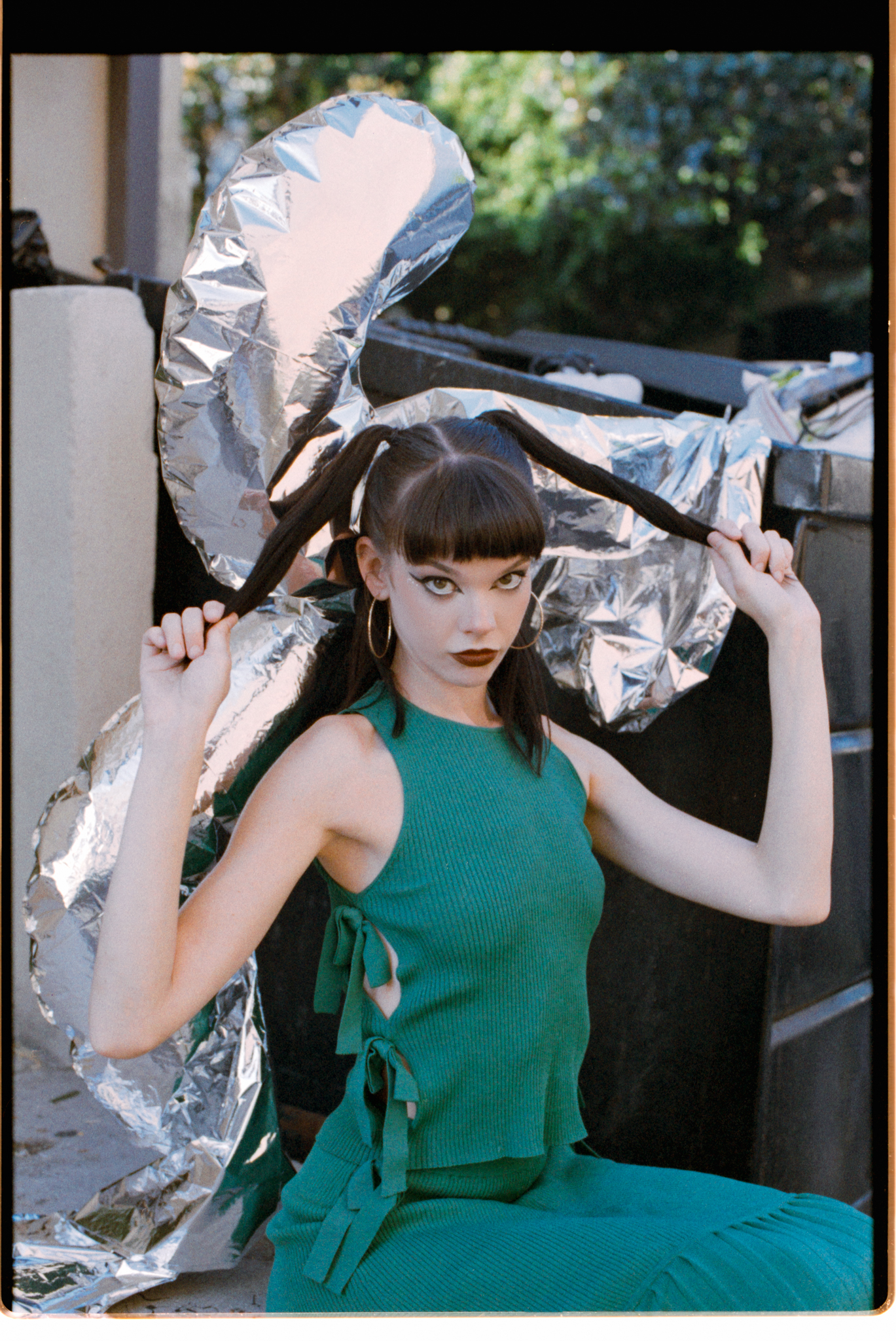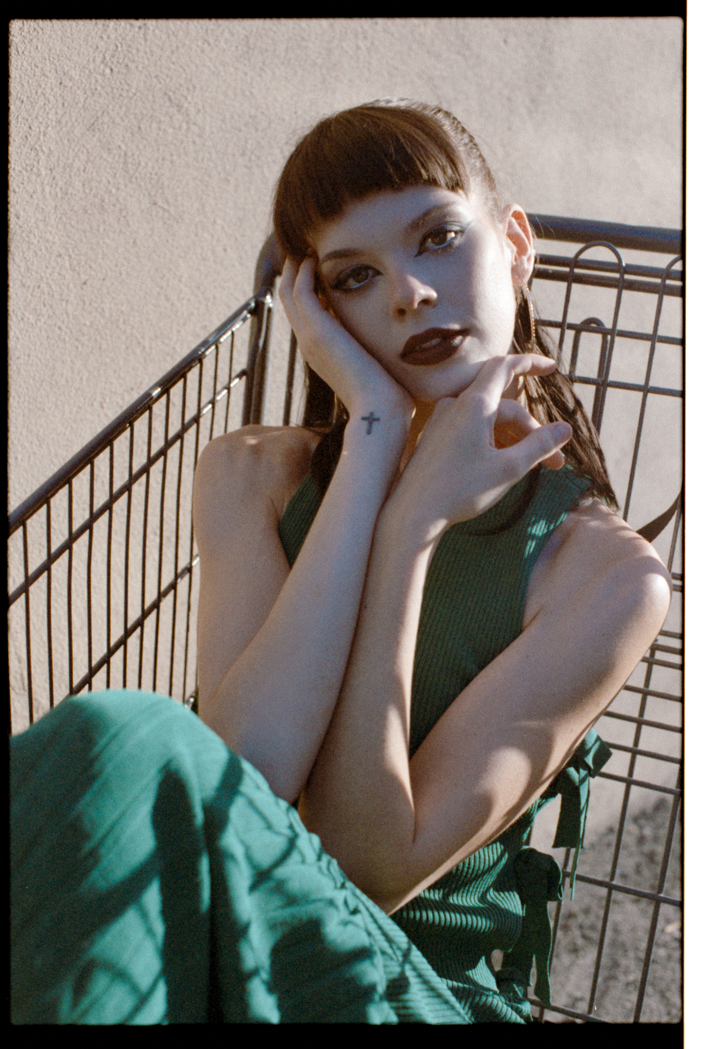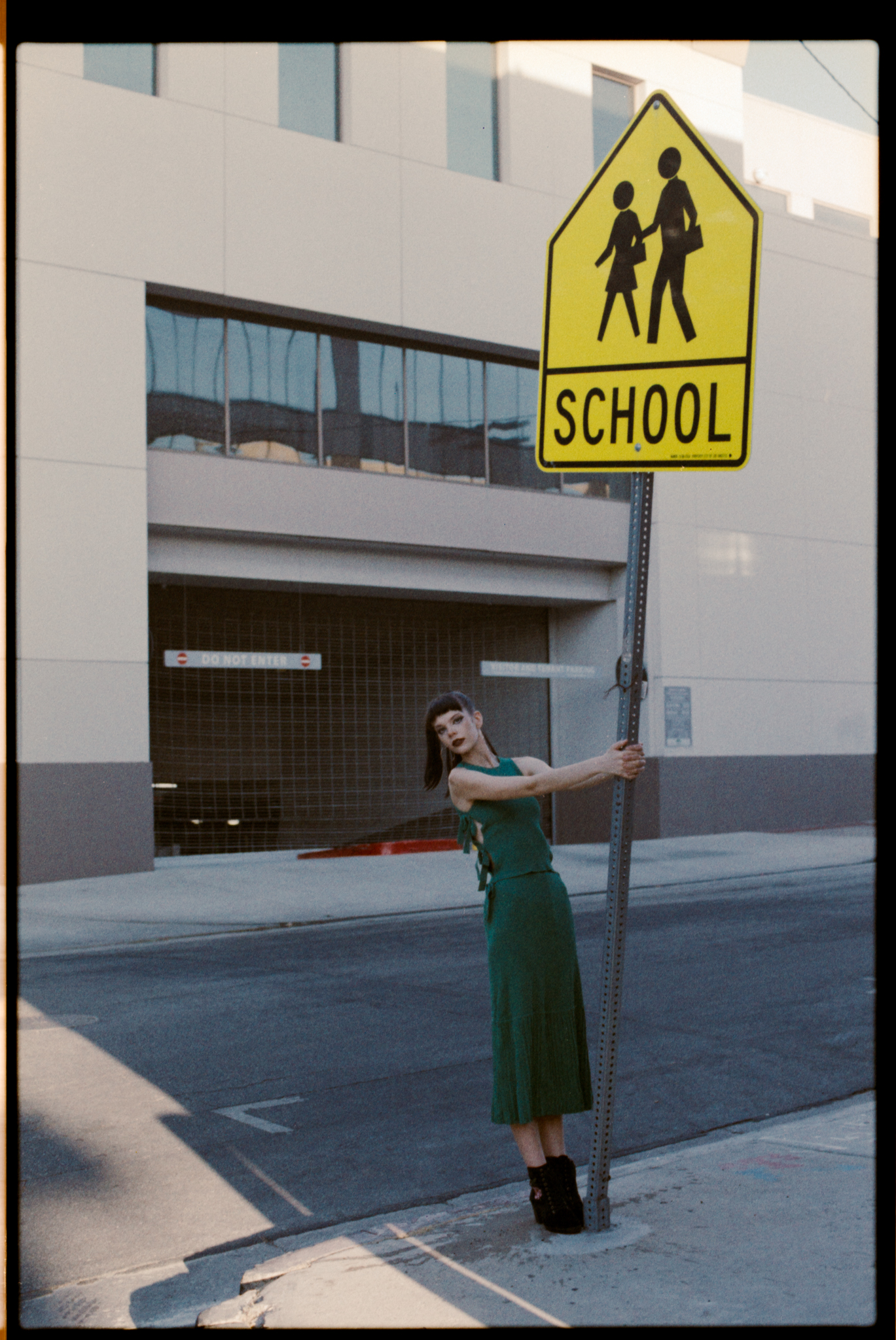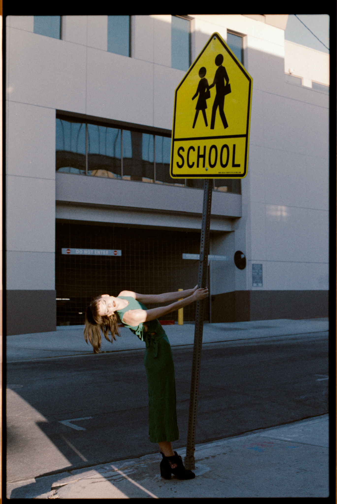 I was shooting at 400 speed. When I try a new film, I always want to try it at box speed first. I saw this dumpster in the alleyway; now we are facing the light, plus the bounce from the wall, the light is soft and even. I think the color and the skin tone look nicer compared to in the shade.