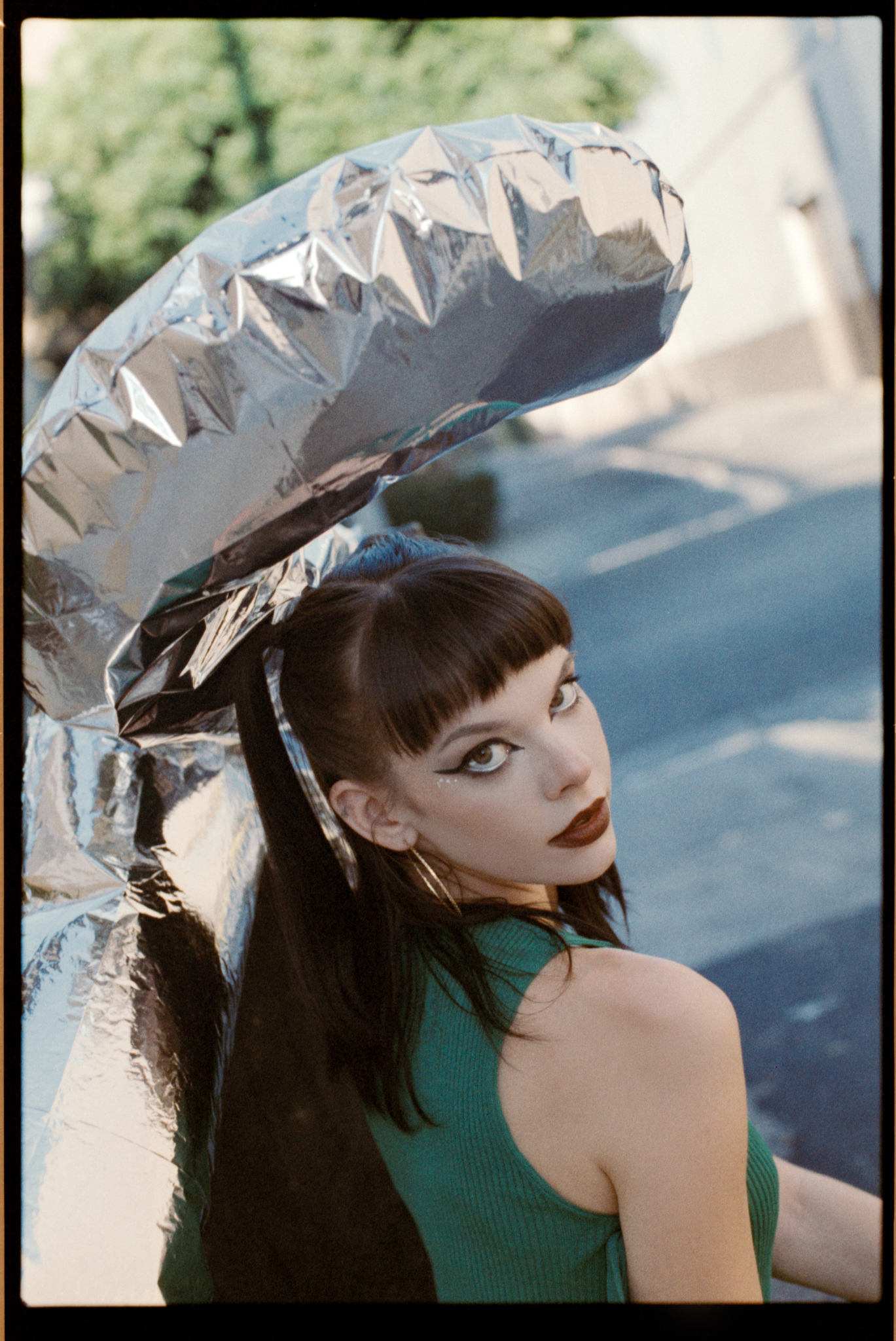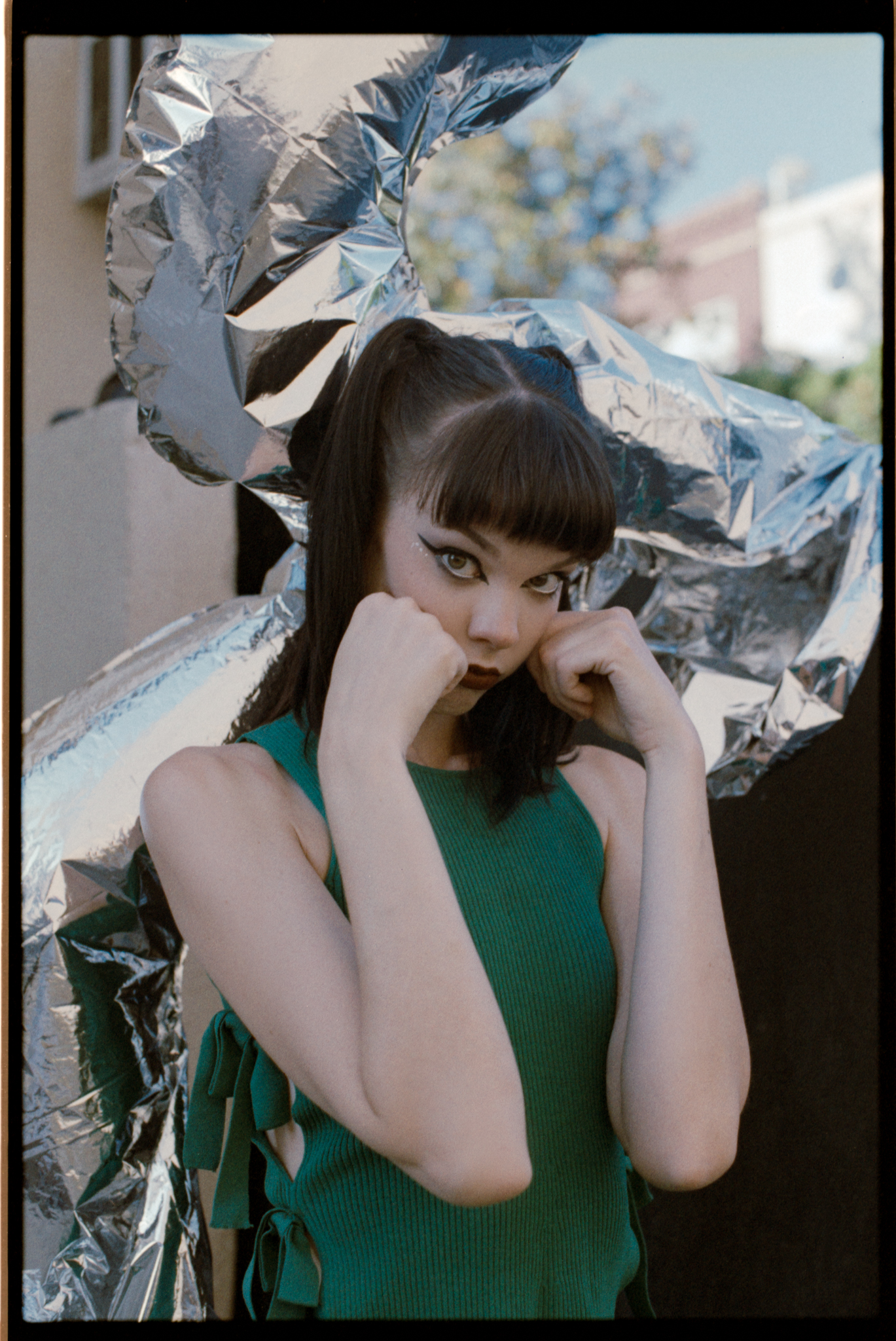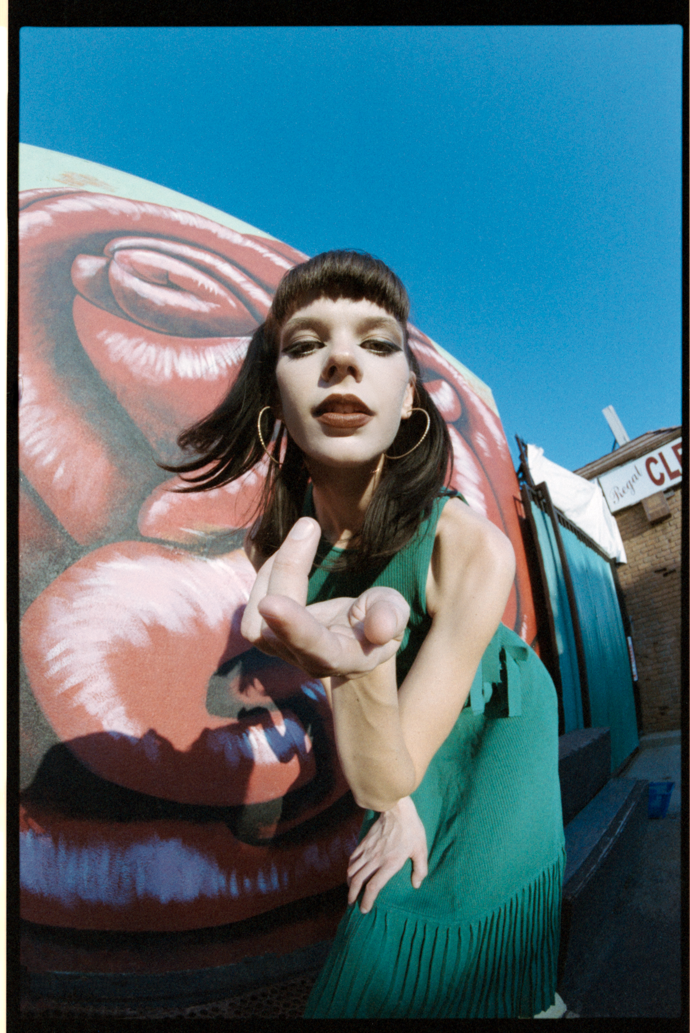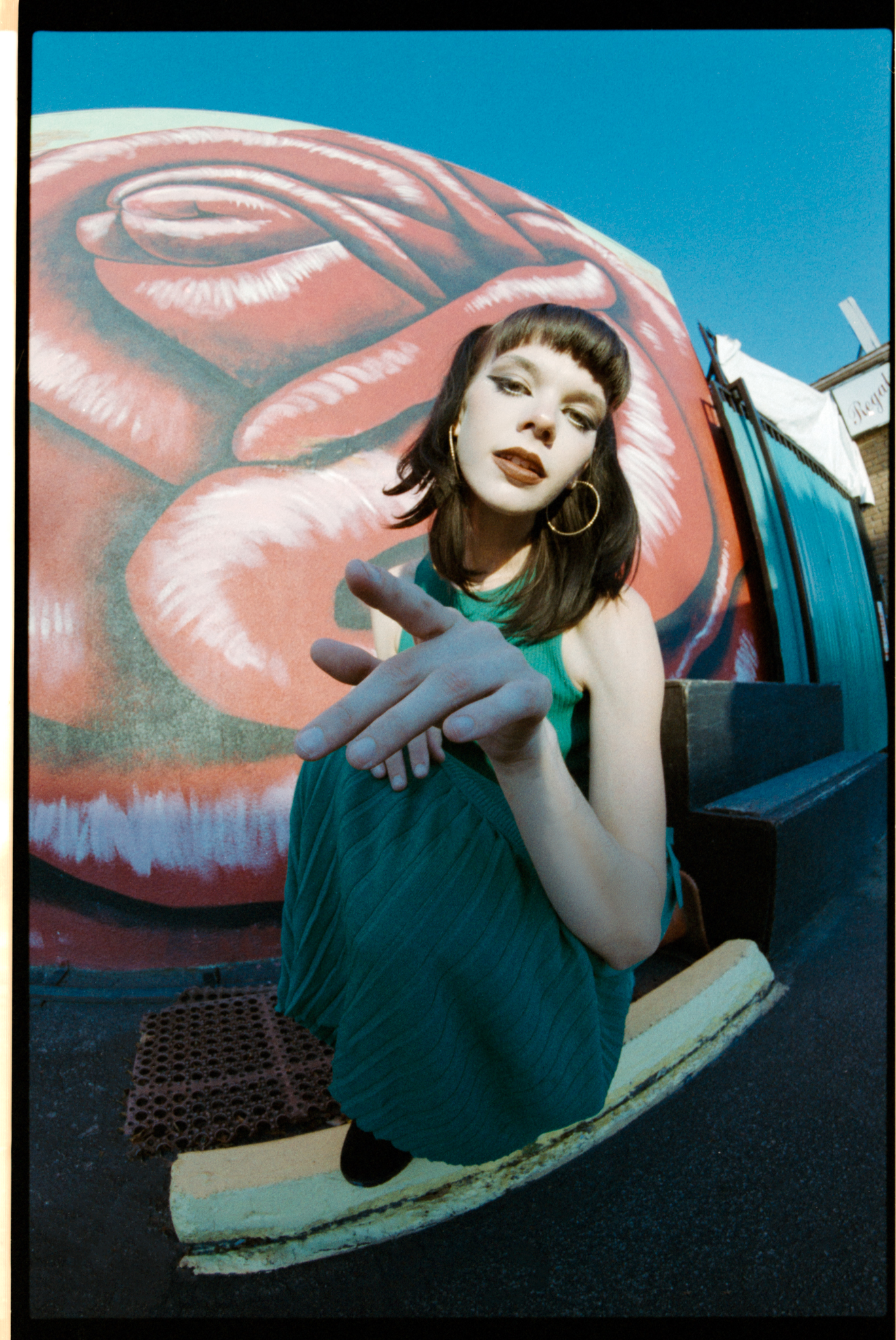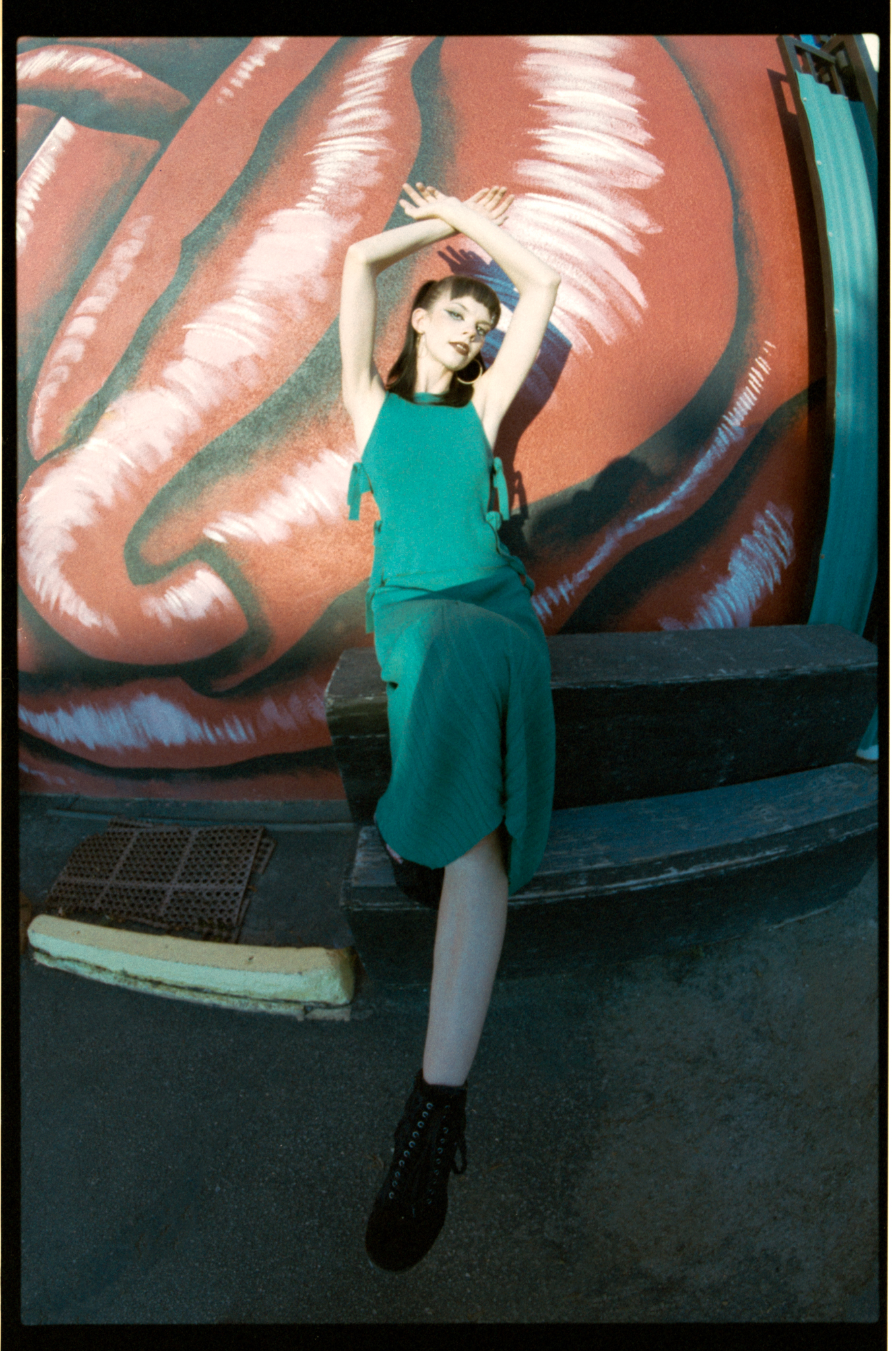 I was shooting at 400 speed. When I try a new film, I always want to try it at box speed first. I saw this dumpster in the alleyway; now we are facing the light, plus the bounce from the wall, the light is soft and even. I think the color and the skin tone look nicer compared to in the shade.