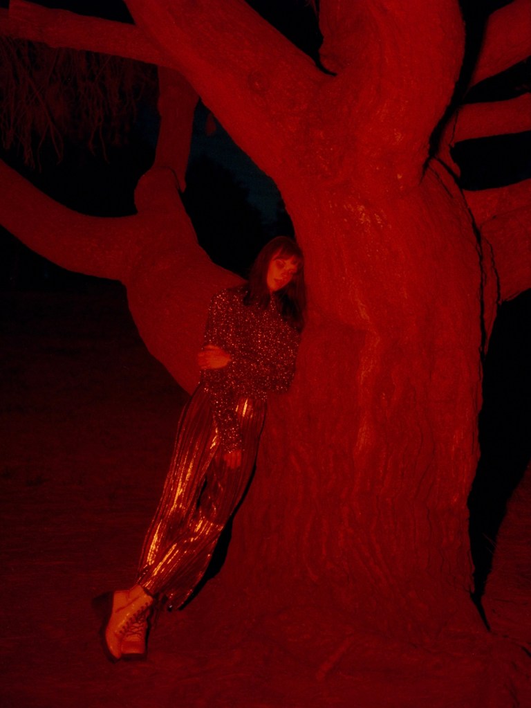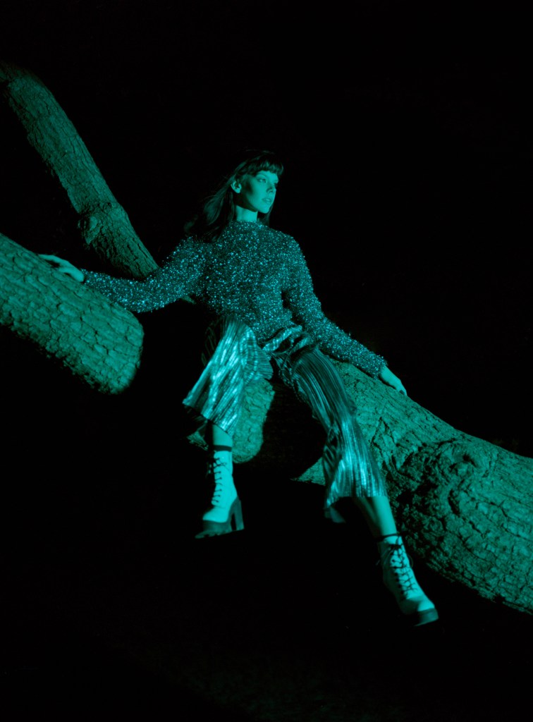 Starting the 2nd roll, I tried to light up the whole tree and have a wider shot. I made the mistake of keeping the softbox on; it turned out very dark and very muddy. Then I removed the softbox, and changed it to a standard reflector that came with the light, and moved the light a lot closer to the model; now we got some nice bright hard light. It definitely works better with this silver metallic-looking outfit.