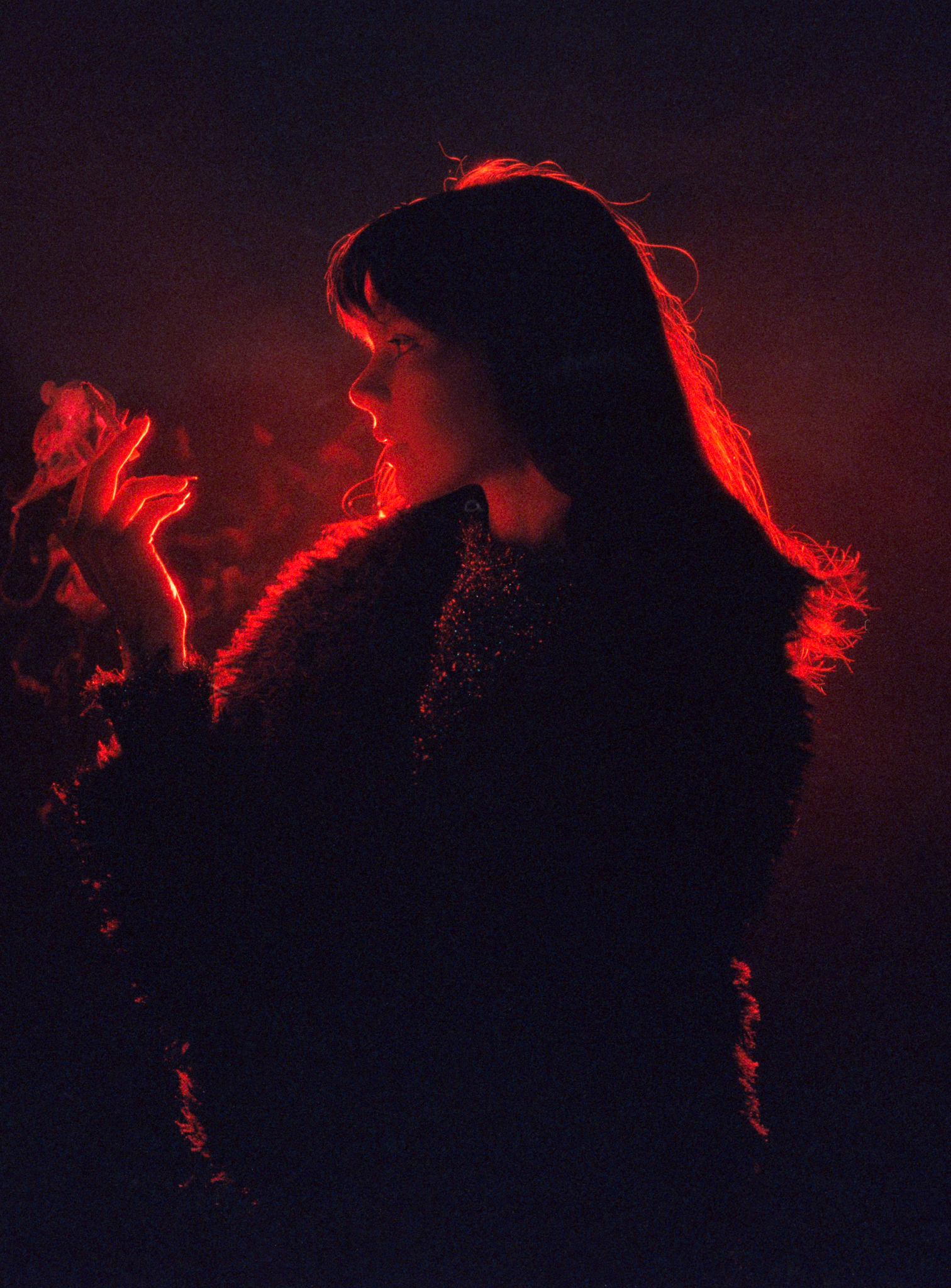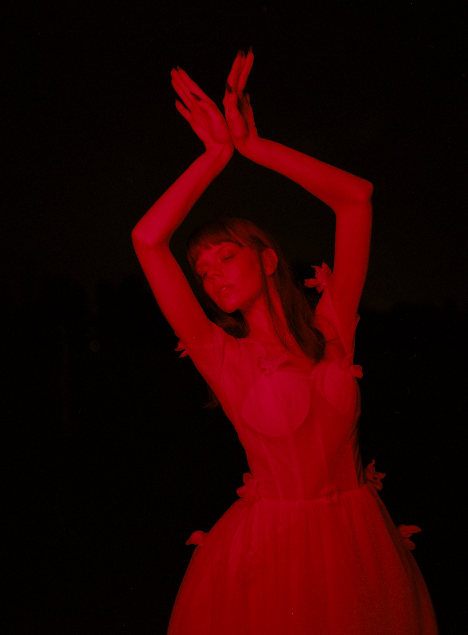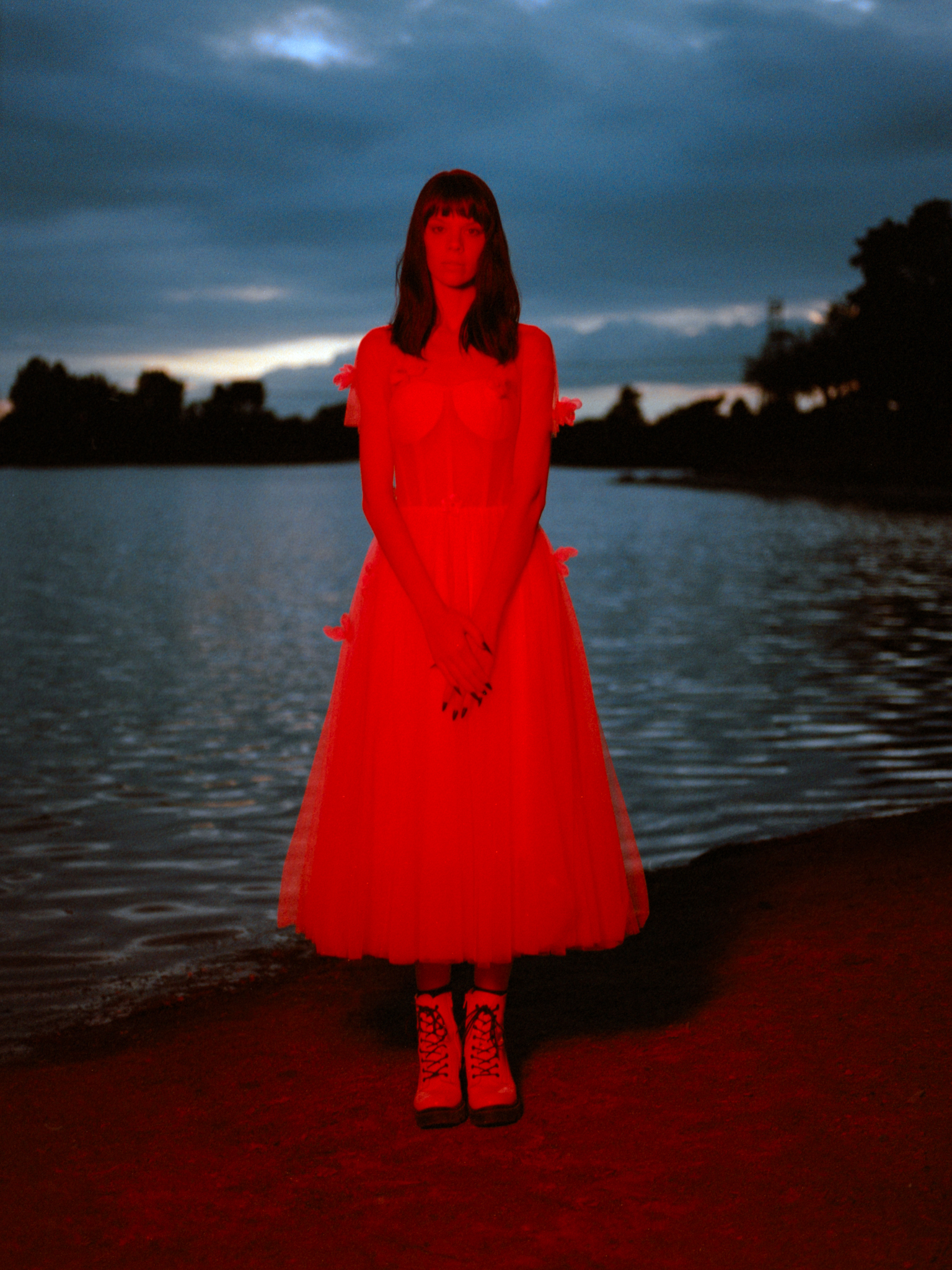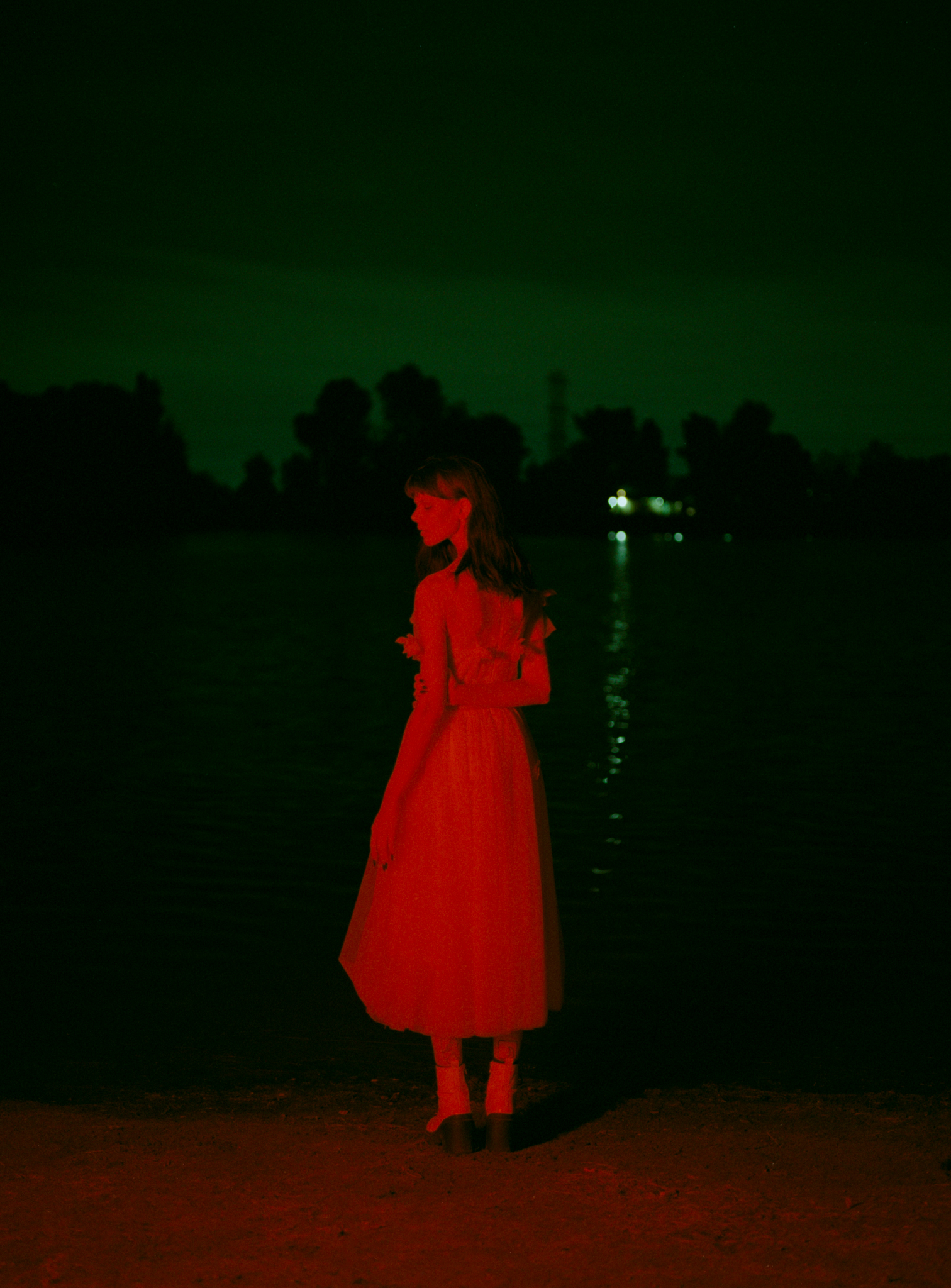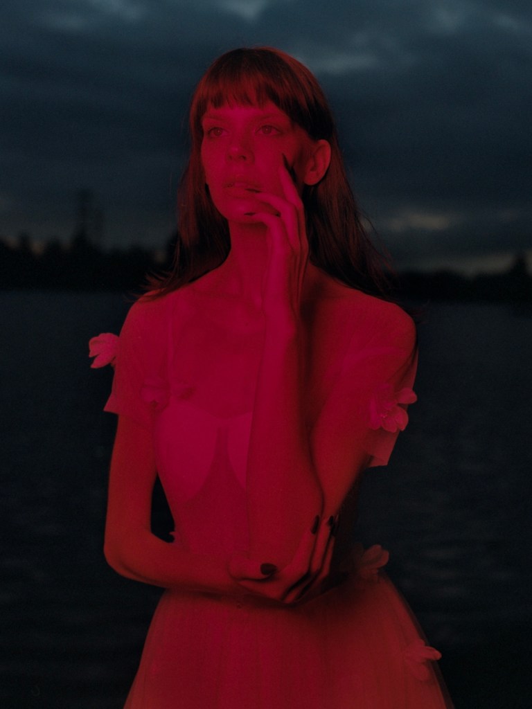 The first setup, I used a small softbox, and the first shot turned out really nicely. I’m surprised by how dense the red is; there are still some lights cutting through the cloud. You see the sky, the water, and her in this highly saturated red light… I really liked it… and then it’s all downhill from here… because the skylights were gone… so fast… soon I lost all the background.